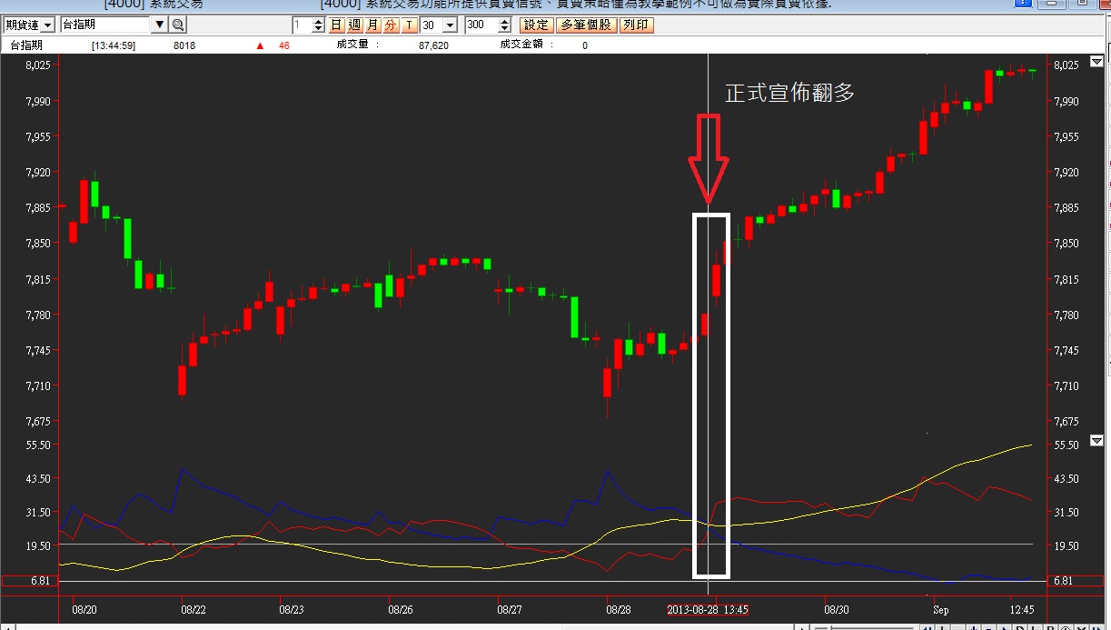 DMI 動向指標 1.DI 幅度在0至100之間 2.+DI 值放大並超越-DI 則多方實力強, 為買進訊號 3.-DI 向上穿越+DI ,則空方實力強,為賣出訊號 4.當ADX在20以下時,代表處於整理期,應退出觀望 而 ADX曲線從20以下向上爬升時,不論當時股價是否漲跌,都可認定,將產生一段有相當幅度的行情 5.一般會將ADX 當作濾網使用,會是不錯的選擇 下圖為近日以DMI 分析圖例 聚沙成塔ING